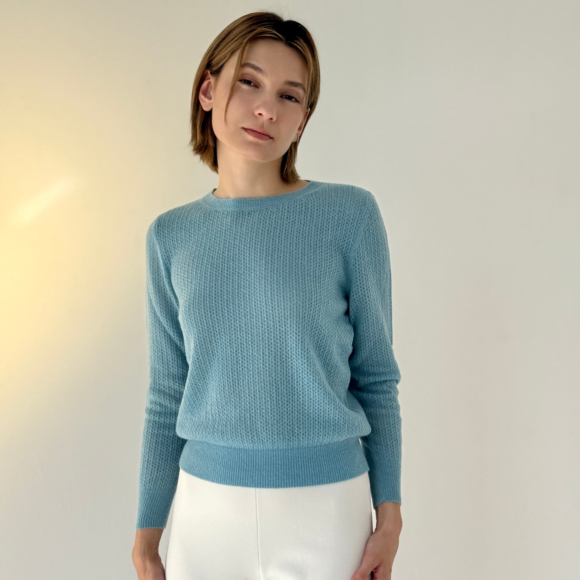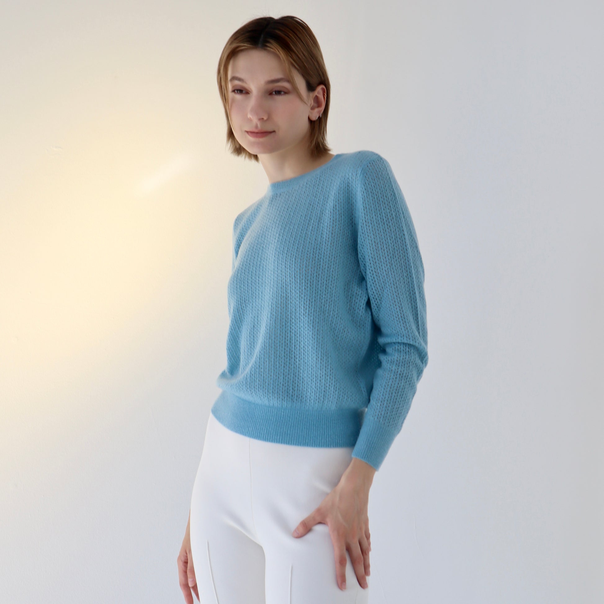 The airy, open-knit texture creates a subtle sheerness that adds dimension without compromising comfort. Finished with a classic crew neckline and finely ribbed trims, this versatile sweater is perfect for both casual wear and elevated styling.