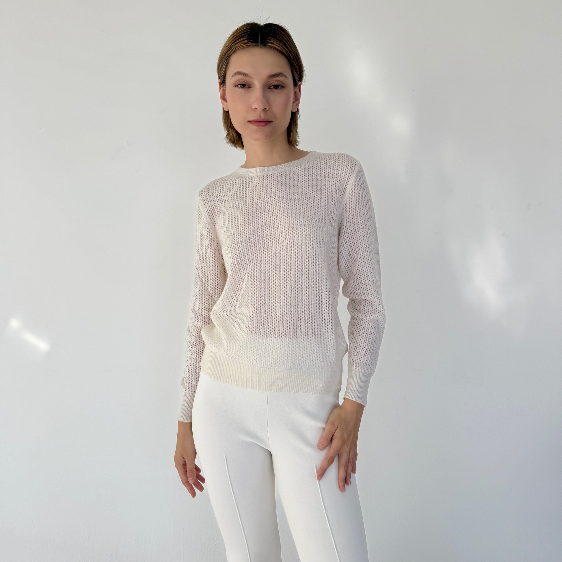 The airy, open-knit texture creates a subtle sheerness that adds dimension without compromising comfort. Finished with a classic crew neckline and finely ribbed trims, this versatile sweater is perfect for both casual wear and elevated styling.