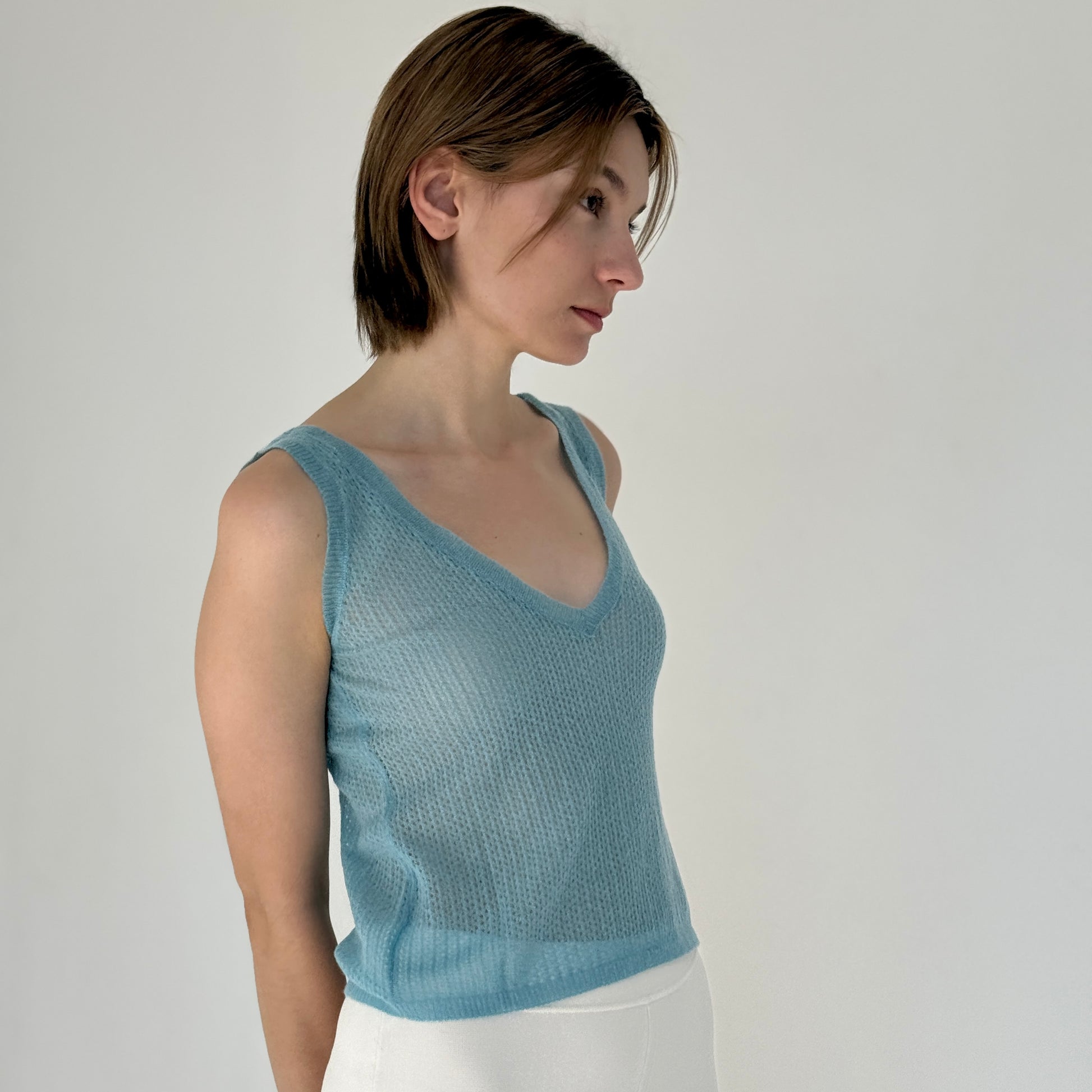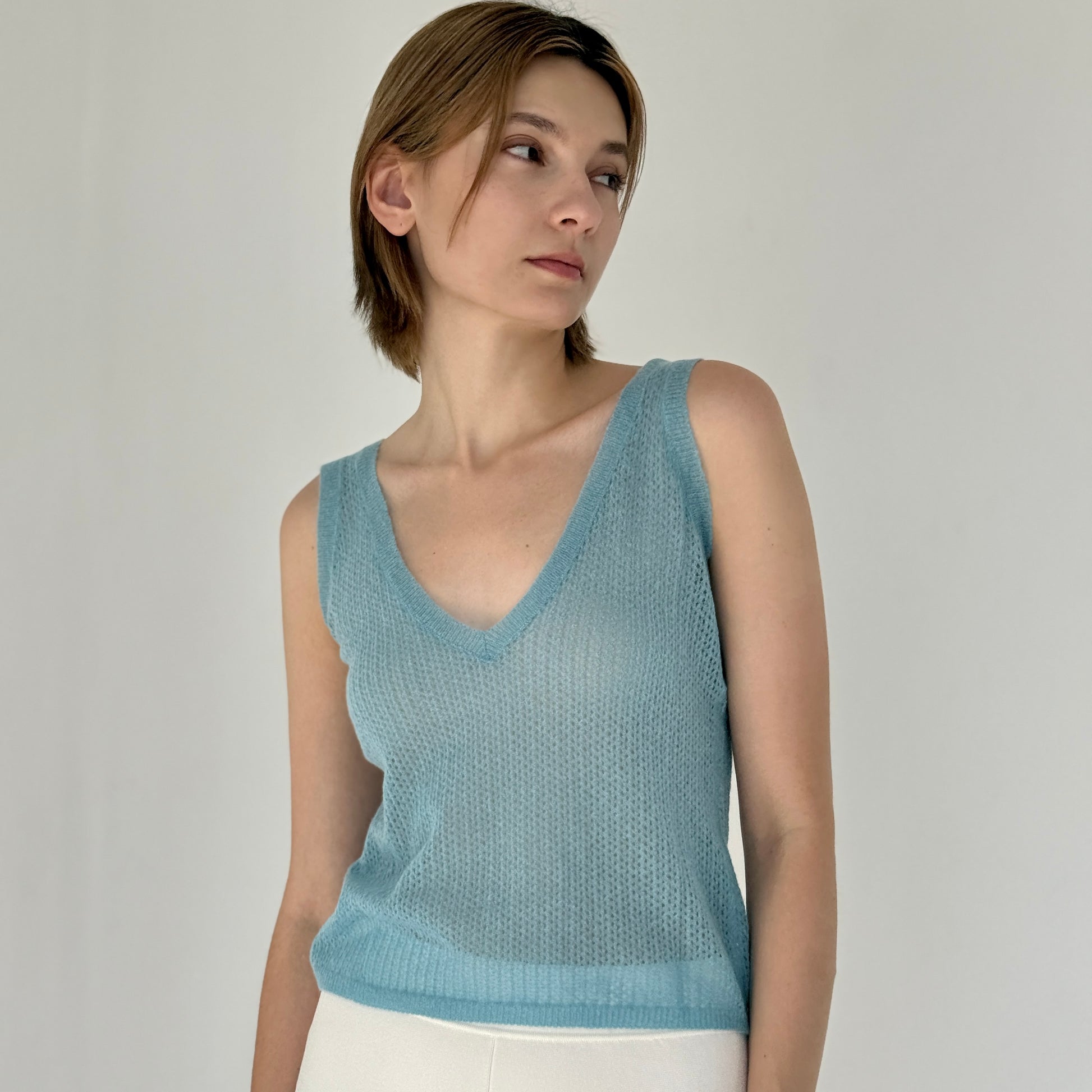 Minimal, breathable, and effortlessly elegant — the Cashmere Blend Sleeveless V in Ice blue is your go-to for understated luxury. Crafted from a featherlight mix of 65% cashmere and 35% polyamide, this open-knit top offers the soft feel of cashmere with a subtle sheerness that drapes like air.
